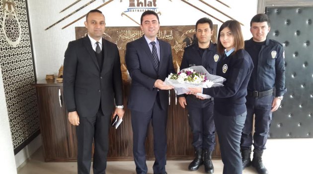 Türk Polis Teşkilatının 171. Kuruluş Yıldönümü kutlama etkinlikleri kapsamında Ahlat İlçe Emniyet Müdürü Erdem Yaban ve beraberindeki emniyet personeli, Kaymakam Bülent Tekbıyıkoğlu’nu makamında ziyaret ederek, çiçek sundular.Ziyaretten duyduğu memnuniyeti dile getiren Kaymakam Tekbıyıkoğlu, Polis teşkilatının toplumsal huzurun korunması ve halkın güvenliğini sağlamak için mesai kavramı gözetmeden, gece gündüz görevini her koşulda büyük bir özveriyle yerine getirdiğini vurguladı.Kaymakam Tekbıyıkoğlu: "Teşkilatımızın her kademesindeki fedakar ve cefakar mensuplarının bu anlamlı gününü kutluyor, görevlerini başarıyla yerine getirirken şehit olan polislerimizi rahmetle anıyor, sabır ve cesaretle görevlerini sürdüren tüm polislerimize de aileleriyle birlikte sağlık mutluluk ve başarılar diliyorum" dedi.